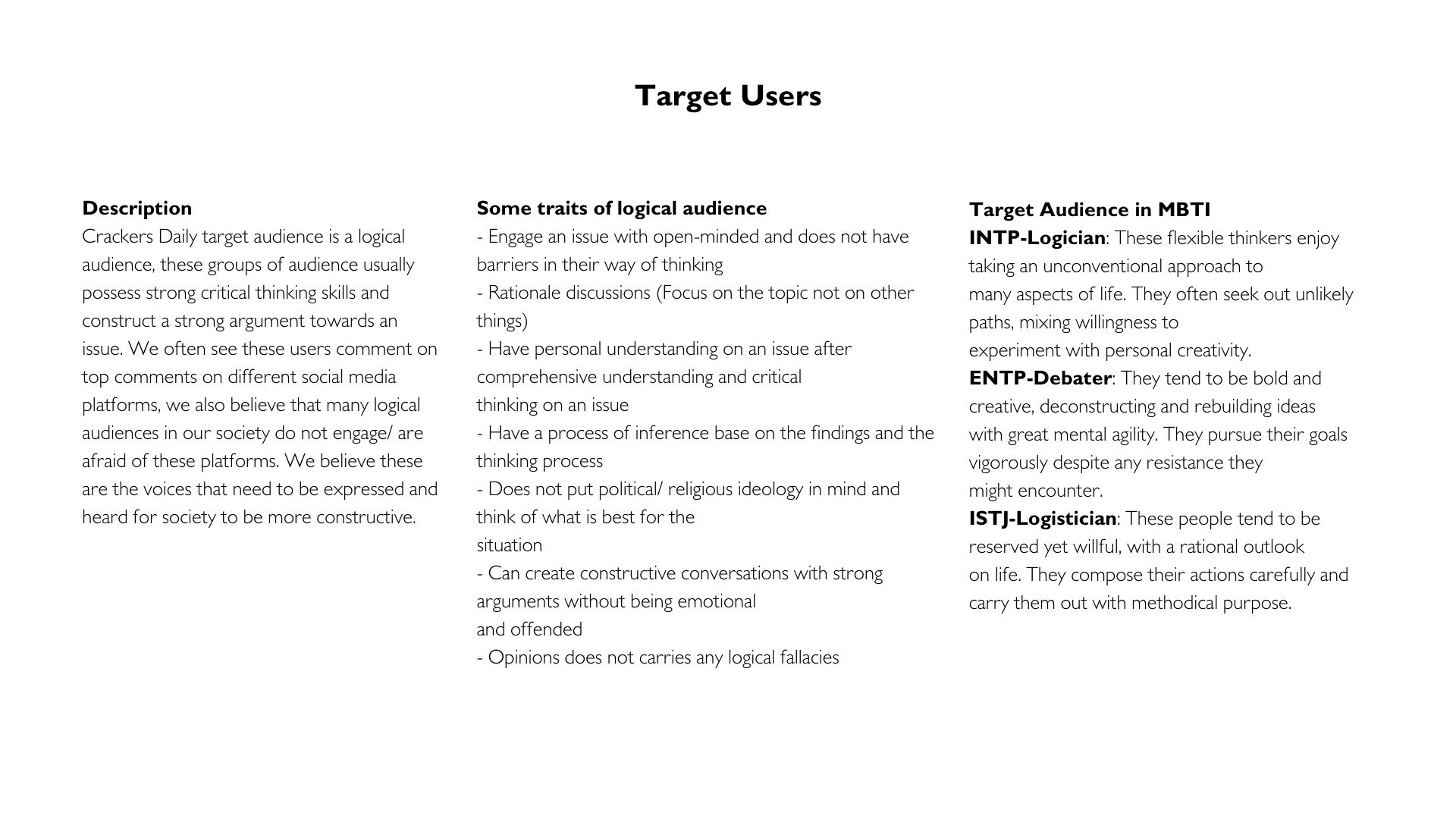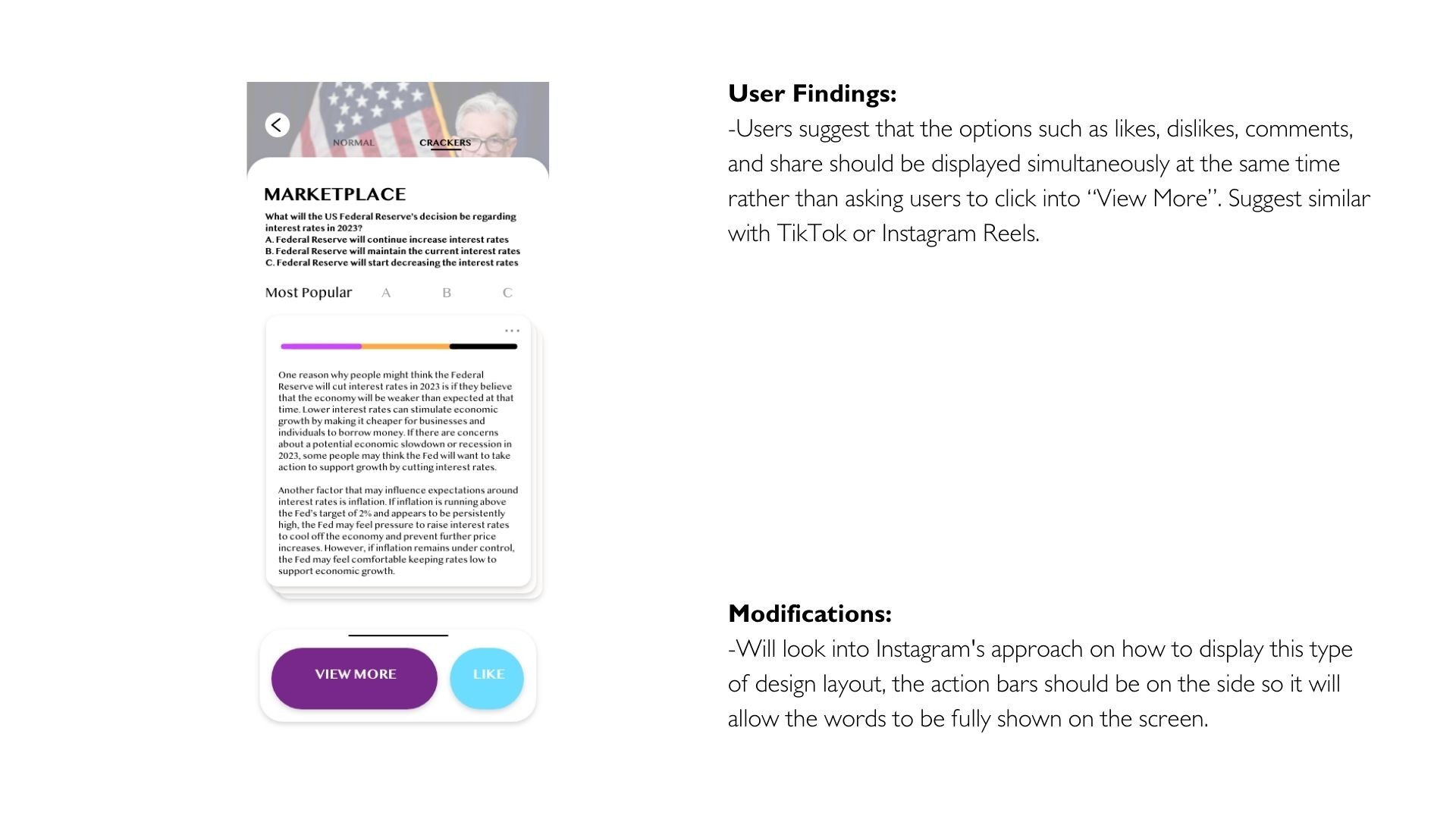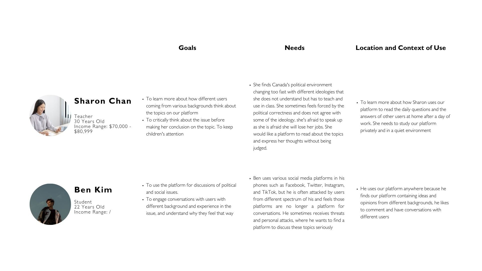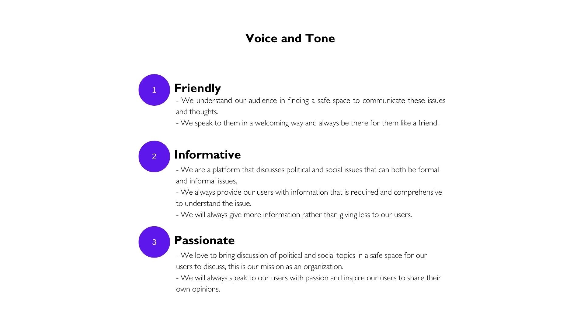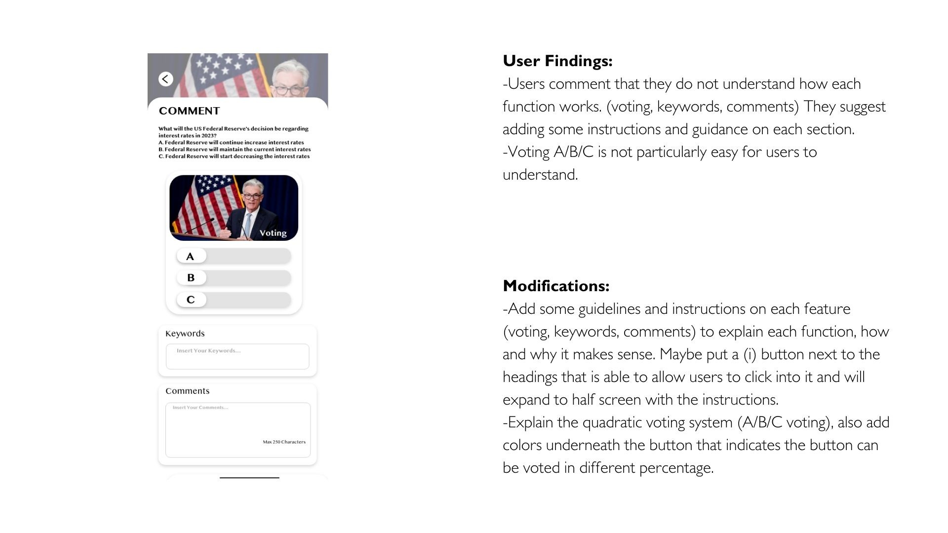 - Users suggest that the product should be user-friendly, easy to use, and anonymous for users from different backgrounds and the topics should be current issues. There could also be background or history for users to understand and create a welcoming environment for them to comment.